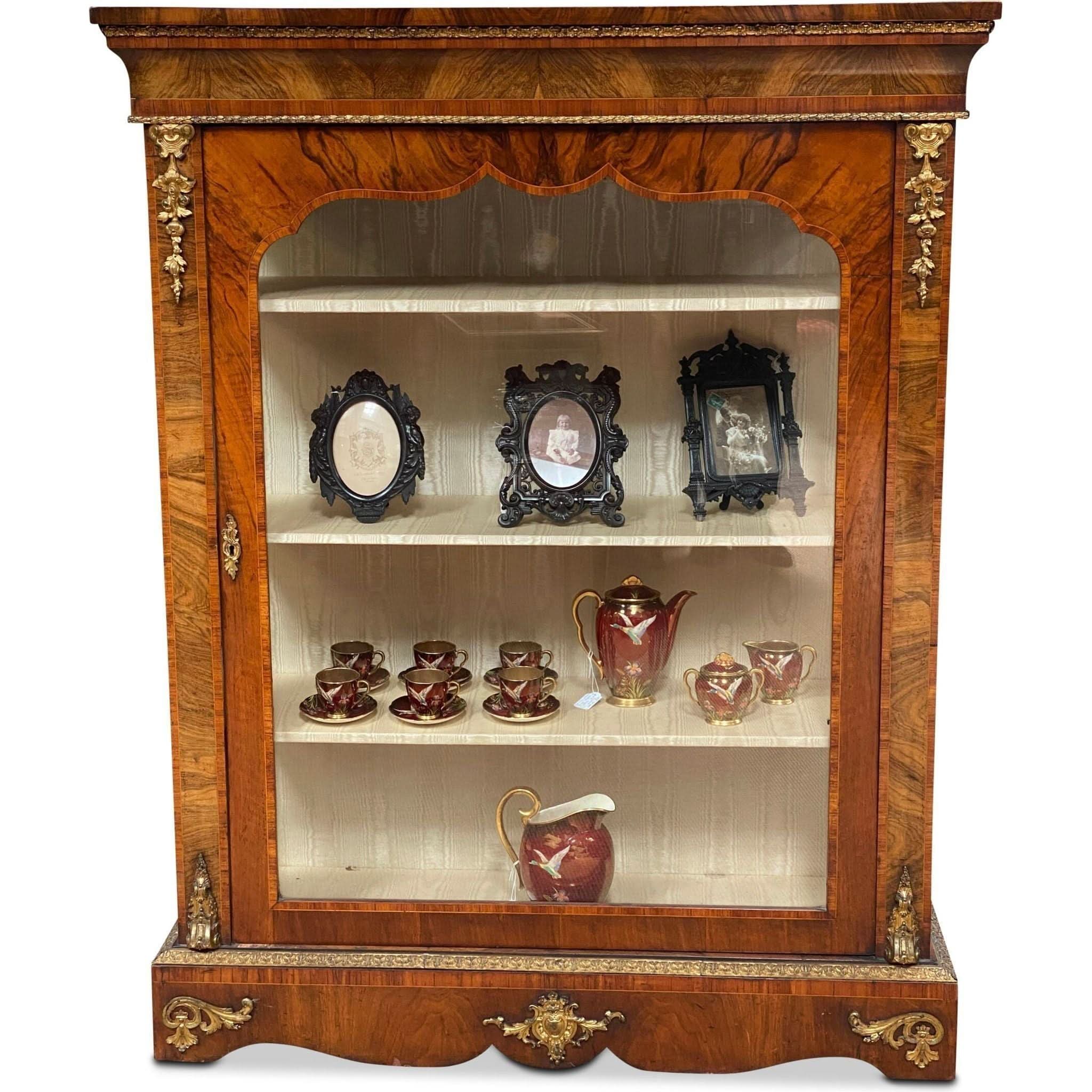 This 19th-century English burr walnut single door pier cabinet, features figured ormolu mounts. The interior is lined with cream waterfall silk, with two shelves. The glass door and glass to each side makes for a beautifully bright cabinet for the display of decorator items. Pier cabinets originated in Victorian England. They were designed to sit in the masonry piers between windows and to have a pier mirror mounted above, with the aim to reflect the light and brighten the room. This superb antique piece dates to c. 1870.