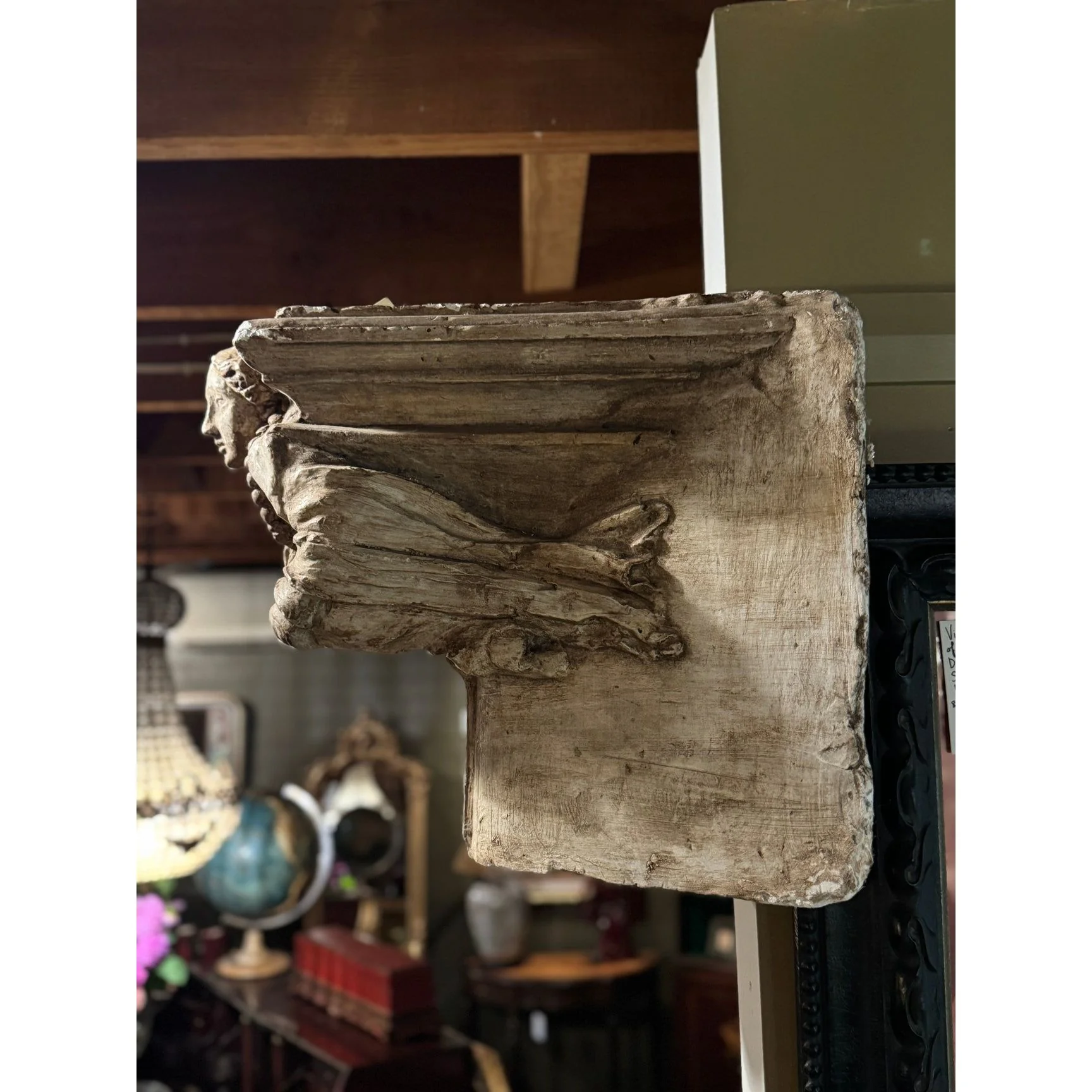 A plaster architectural corbel modelled as a devotional angel, originally designed to project from a wall beneath a cornice or ledge. Likely salvaged from a church or ecclesiastical interior in Belgium, dating to the late 19th to early 20th century and reflecting Baroque Revival influence. The surface shows wear, losses and old paint remnants consistent with age and original architectural use. Retains an original Belgian removals tag from Bruges, indicating professional architectural salvage. I’ve hung it on a wall with an “L” shaped bracket.