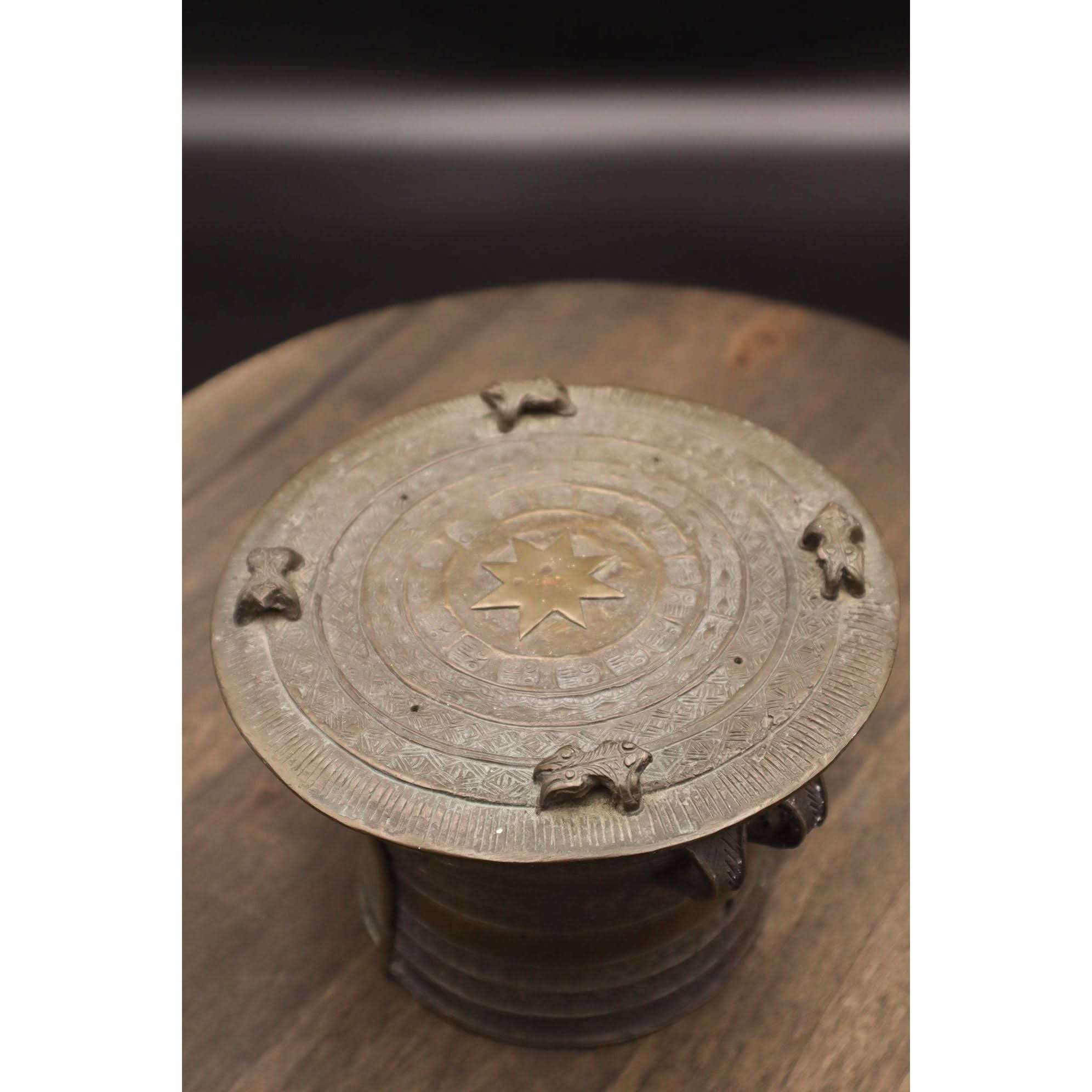 Burma (modern day Myanmar), late 19th to early 20th century CE. A fabulous small bronze drum known as a Rain Drum or Frog Drum, with an impressive decorative program and rich iconography. The tympanum caps the hollow cylindrical and waisted body with two flanking handles beneath the rim. The tympanum is adorned with 5 engraved concentric patterned circles surrounding a central eight-pointed star, with four frogs positioned equidistantly around the rim. Around the body of the drum are additional intricate engraved decorations and rosettes.
