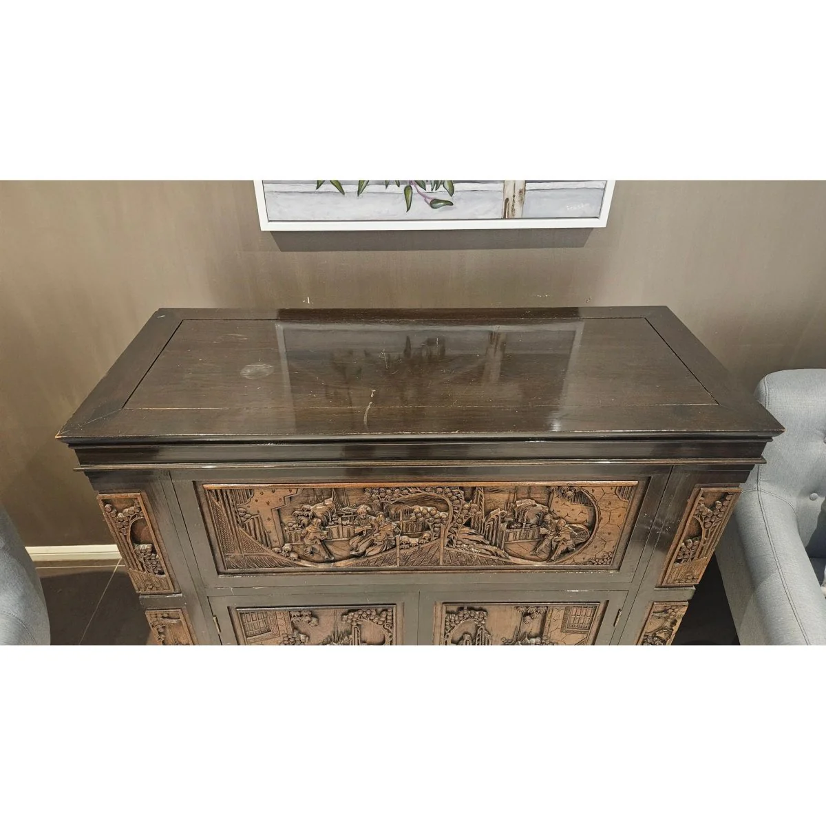 Early to mid century Century Modern Carved Ornate Chinese Rosewood Flip Top Dry Bar / cabinet. Ornate rosewood with very intricate hand carved details. Genuine antique item. Very good condition with slight wear consistent with age and use
