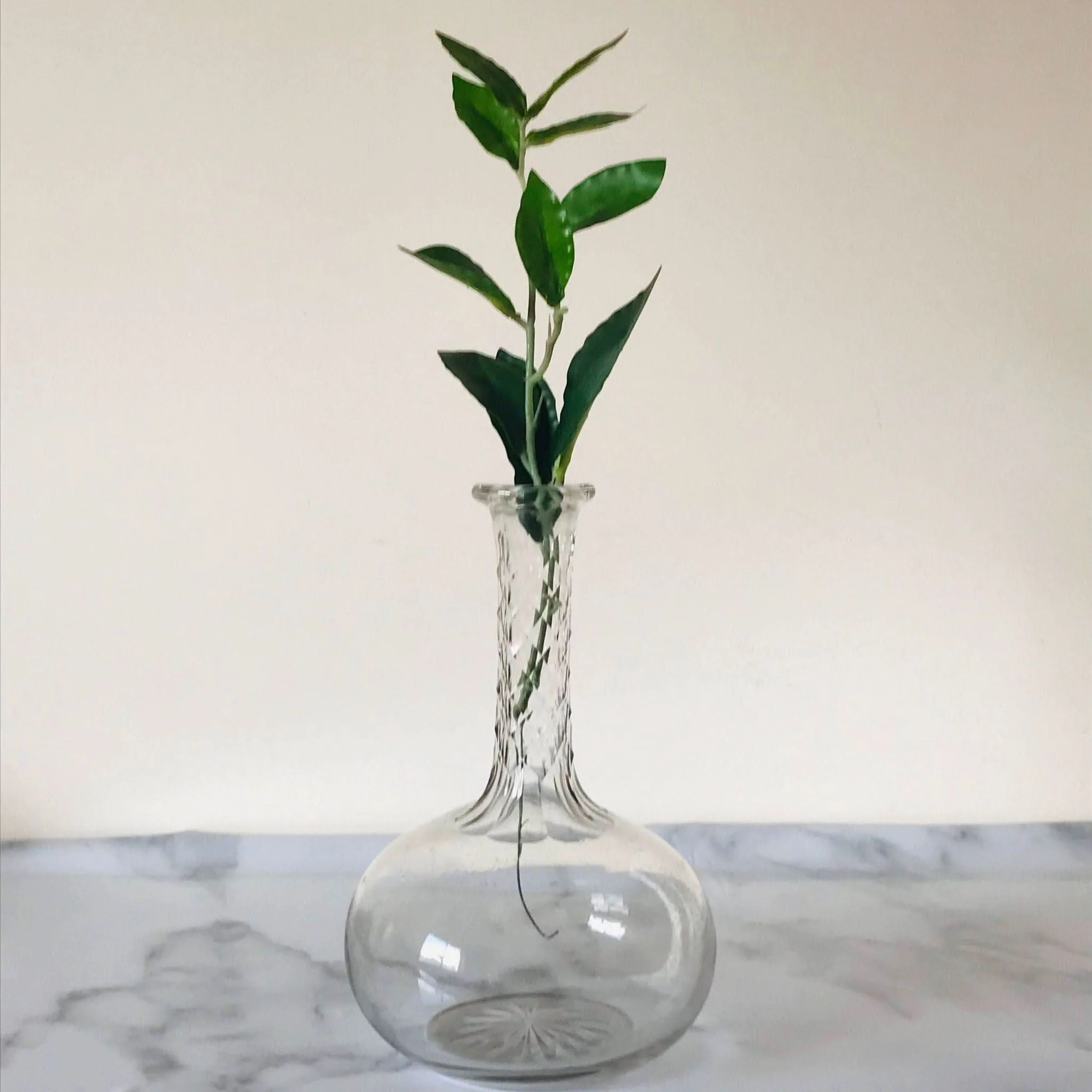 Antique English cut glass decanter. With an elongated neck, diamond cut facet, bulbous body and star cut base. It is in good condition has some light wear consistent with age.