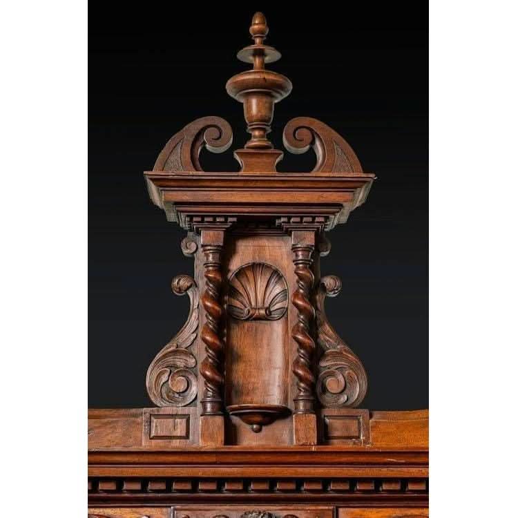 At the top of the cabinet sits a finely carved pelmet mounted with 3 turned finals,.