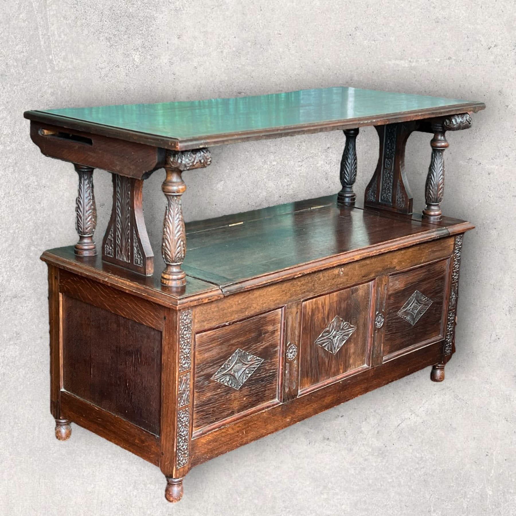 Arts & Crafts Oak 'Monks table', transforming from table to settle to coffer, with panelled base on short feet, the arms carved with acanthus with scroll ends, the inside of the top with diamond-shaped foliate carving containing 4 shield panels inscribed 'APRIL/ 13. /19/26"