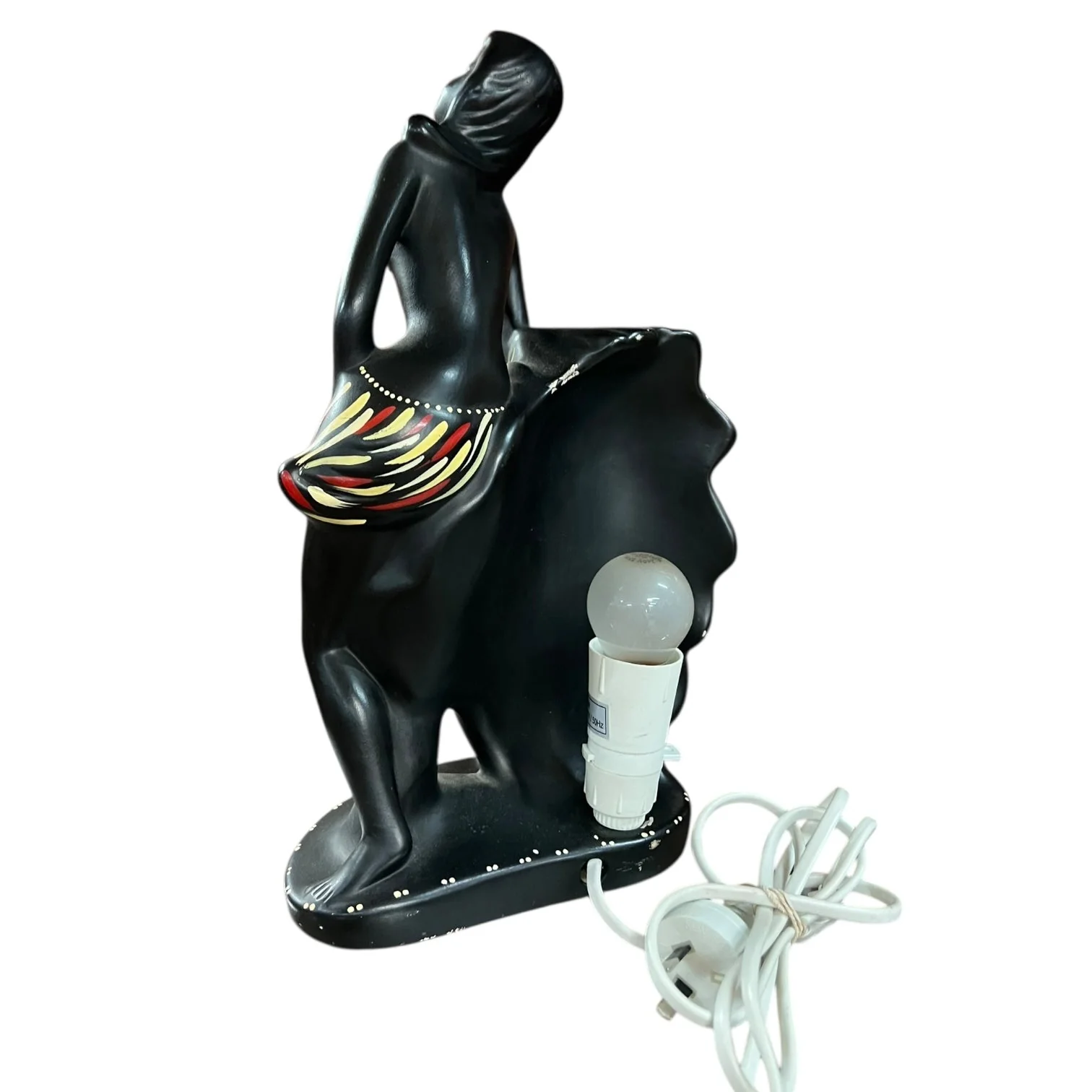 This sculptural lamp features Barsony’s signature matte-black finish with hand-painted details in red, green and cream. The elegant kneeling figure, posed beside a decorative drum, captures that classic Barsony glamour and tropical mid-century style.