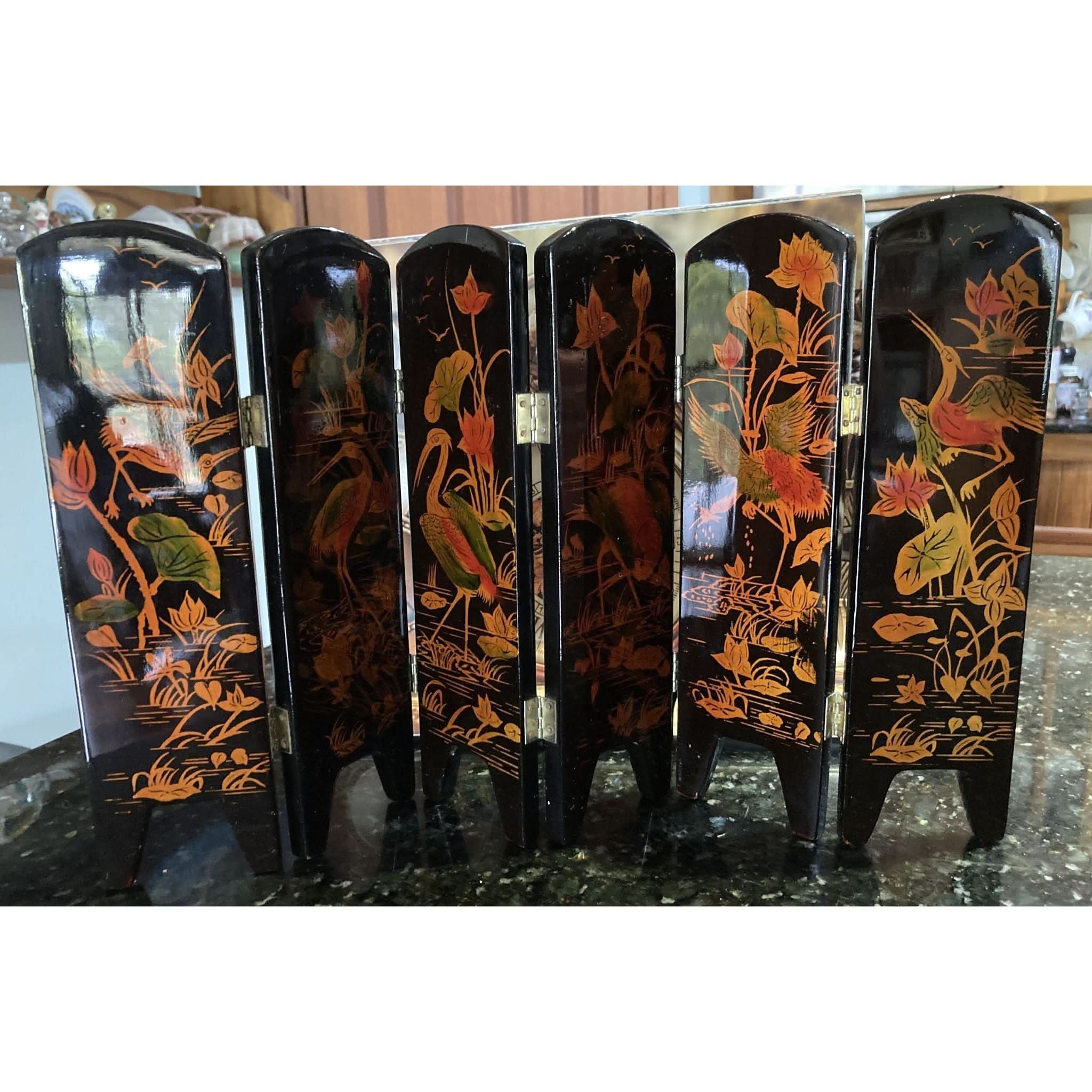 Beautiful lacquered Mother of Pearl wooden Oriental mini folding table screen. Reversible. Asian Decor.
