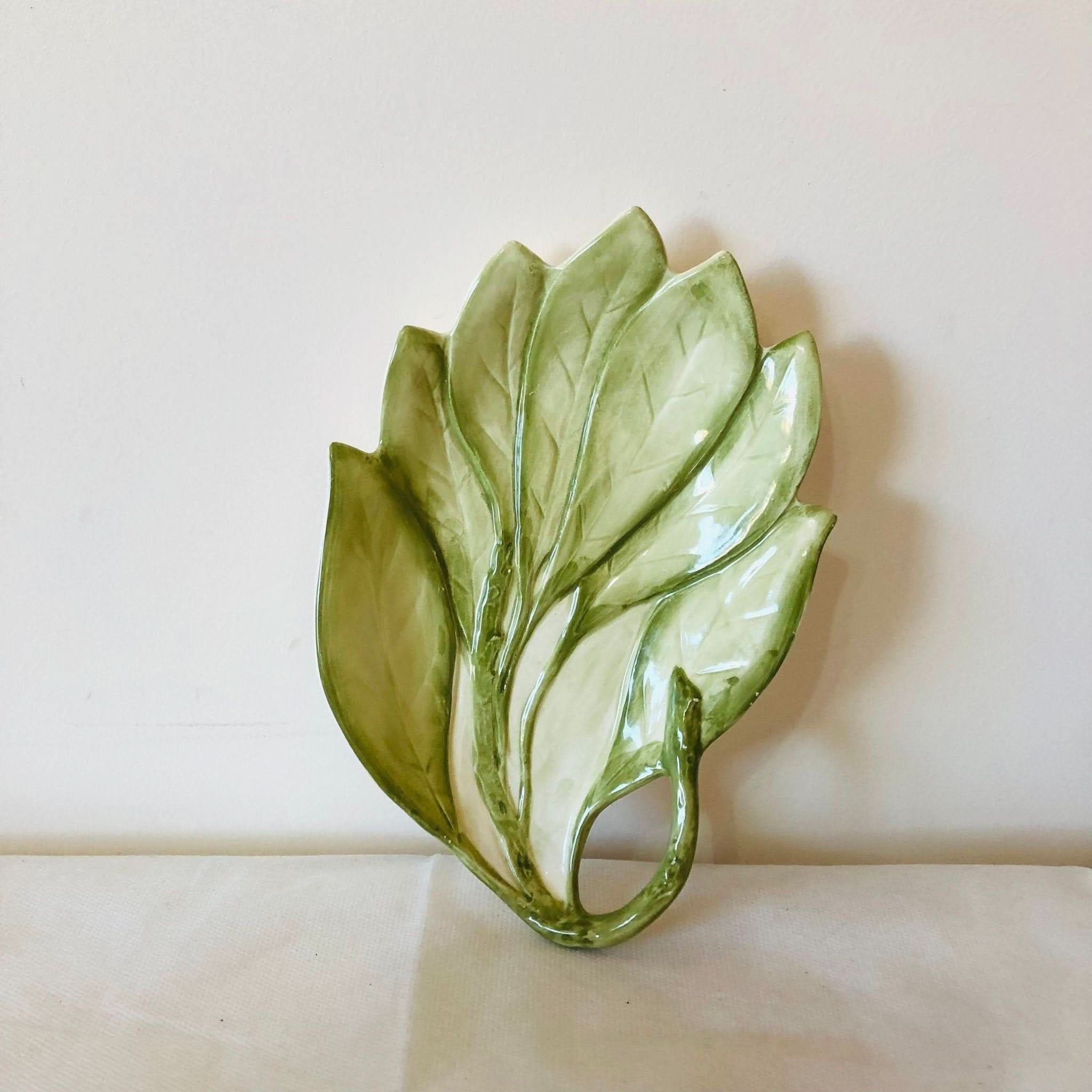 This is a beautiful vintage dish with pale and dark green colour in the shape of a leaf. Although it is difficult to find maker or period. However a rare and unique piece. It is in overall very good vintage condition, typical of its age and usage. This tray has a loop handle for easy carrying. A nice tray for candy, snacks or nuts.