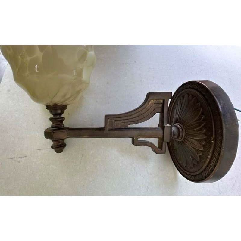 Fixtures have a nice patina and have been fully re-wired. Can be mounted with the shades either facing up or down. Each is 220mm high (including shade) and extend out 280mm. The (solid cast) wall mounting plates are 150mm high x 115mm wide.