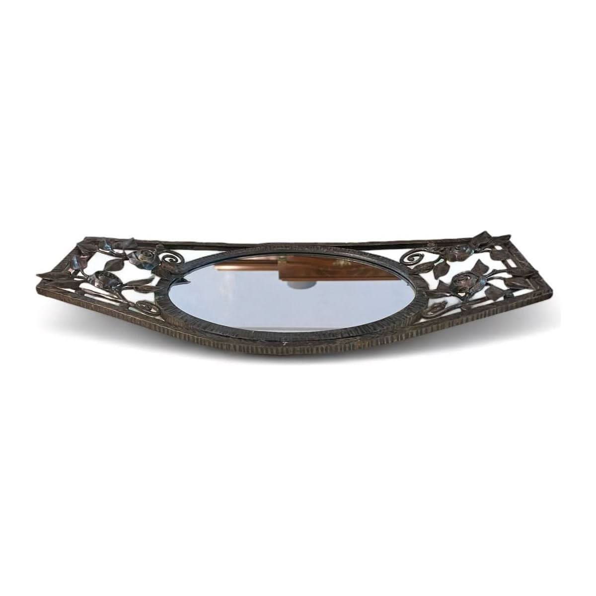 French art deco oval mirror set in a wrought iron frame decorated with flowers.