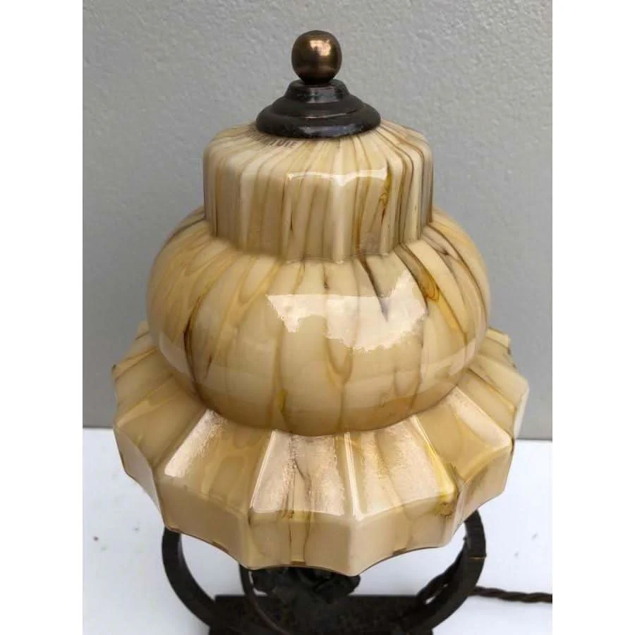 A very nice 1930's French Deco iron 'ring' lamp with rose flower decoration and original moulded yellow/brown glass shade. Fully re-wired.