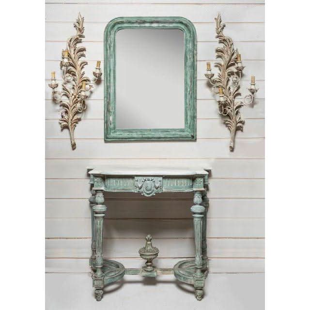 A 19th century French Louis XVI style painted consul table, with faux marble top. Supported on carved and reeded legs joined by a stretcher at the base.