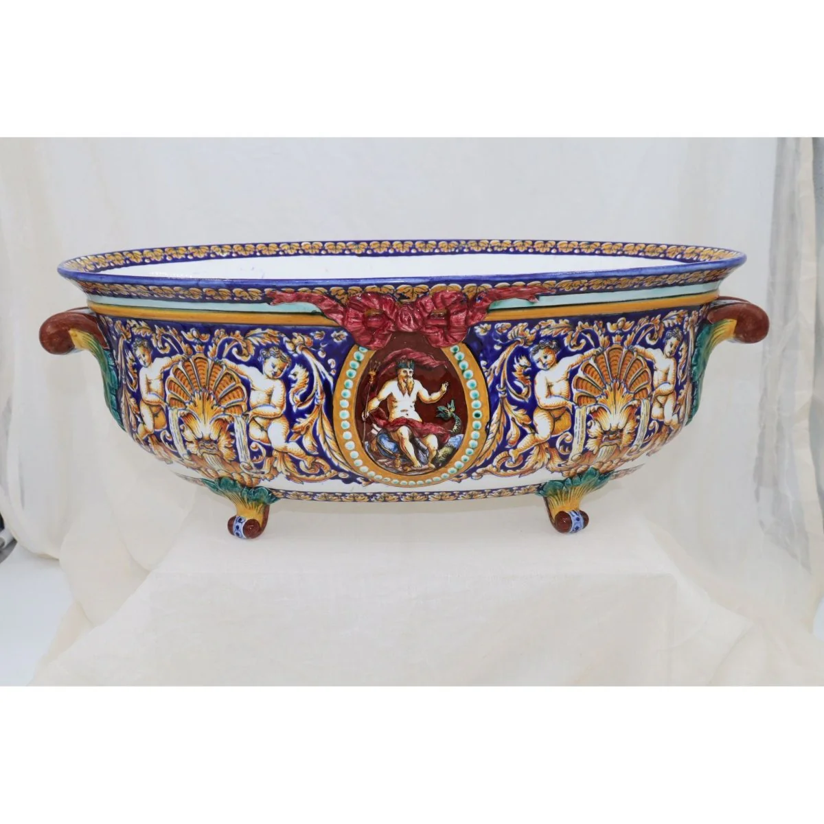 This large, very colourful, twin handled Gien Faience jardiniere is hand painted and features a god and goddess on either side, seated below red coloured bows and numerous cherubs supporting shell shaped fountains. It stands on four feet and measures 510 mm (20 inches) in width, 295 mm (11.5 inches) in depth and stands 180 mm (7.25 inches) high. It does have some scratches on the inside, as you would expect, where pots etc. have stood over the last 150 years, but nothing of any great concern. There is also a small, shallow star crack to the base, as shown in the photo of the mark, but it doesn't come through to the inside. Overall, it is in very good condition. Made in France, it dates from the period 1871-5.