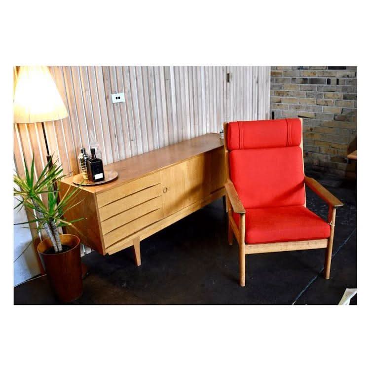 A solid oak lounge chair by famous Danish designer Hans J Wegner. The chair was produced by Getama in Denmark and has been reupholstered in a red wool fabric from Kvadrat Textiles.