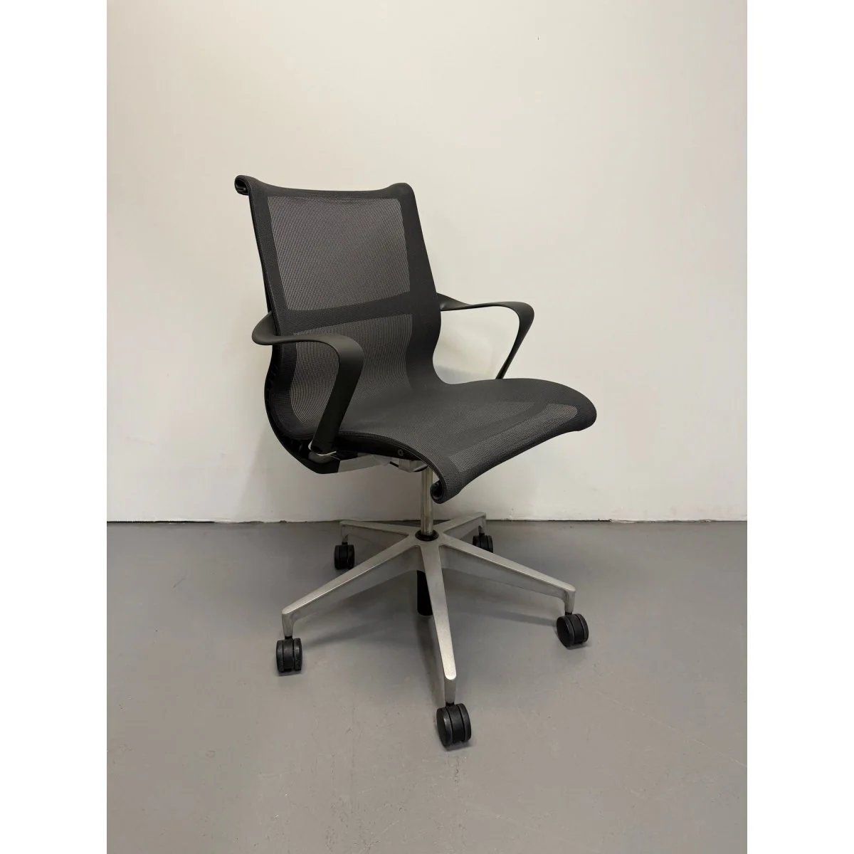 The Herman Miller Setu is a lightweight, flexible task chair built for modern workspaces. Its kinematic spine moves with you, providing natural support without complicated adjustments. The breathable mesh back keeps you comfortable throughout the day, and the Graphite Grey finish gives it a clean, minimal look.