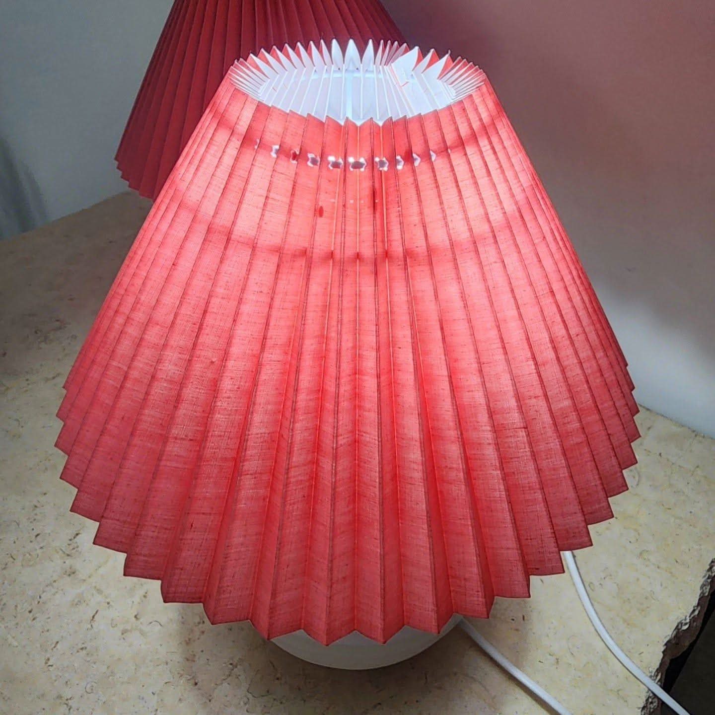 Upcycled vintage ribbed terracotta lamp base with brand new pleated lampshades. Some unevenness on the base and a light mark on one of the lampshade.