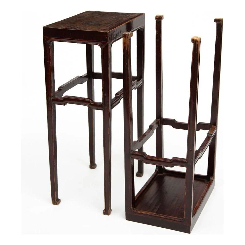 This is a very subtle pair of stands. The top is a single piece of timber. They have humpback stretchers with the long tapered legs finishing in inward horse hoof feet.