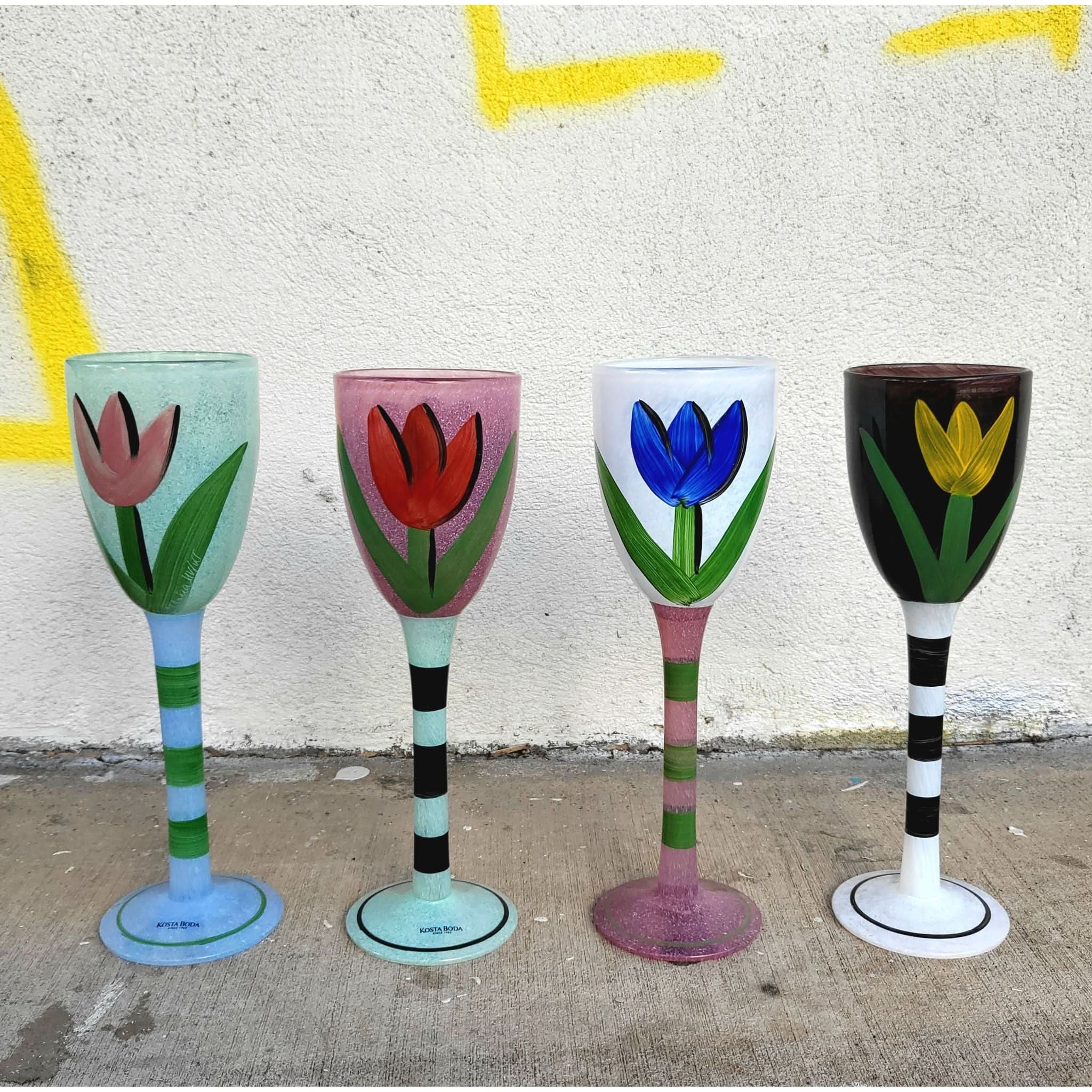 Each goblet features Hydman-Vallien’s iconic tulip design, hand-painted in bold colourways (yellow, blue, pink, and red), with whimsical striped stems that celebrate her playful, postmodern aesthetic.