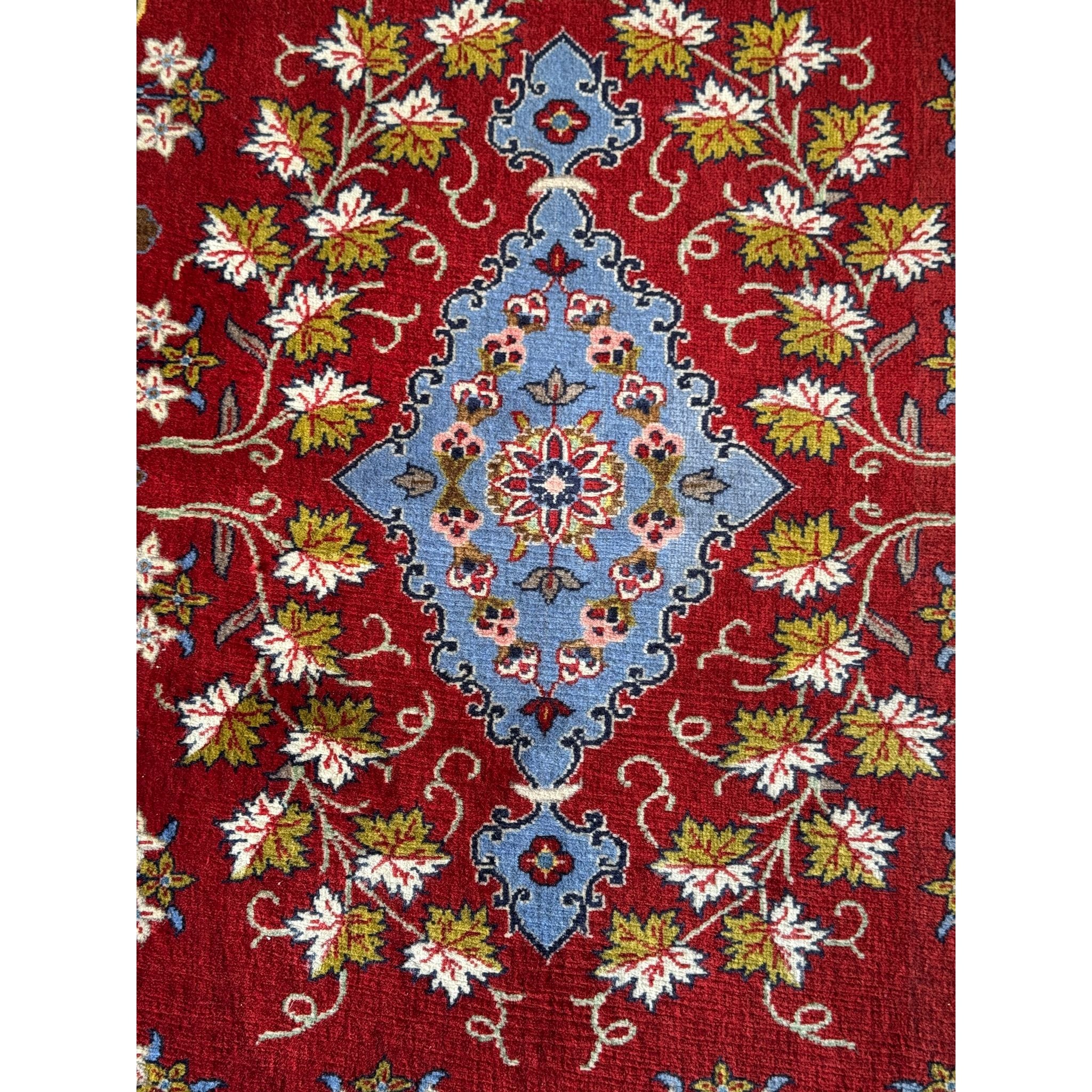 A finely hand-knotted Persian rug featuring a classic central medallion on a deep red ground, framed by a navy floral border. The palette of soft blue, ivory and olive gives it richness without overpowering a space.