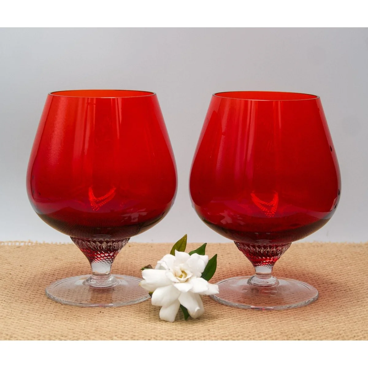A stunning example of mid-century glassware craftsmanship, this ruby red crystal brandy sniffer captures the elegance of 1960s design. The distinctive twisted stem adds visual interest and authentic period character,Hand-crafted from quality crystal, this piece showcases the superior clarity and weight that defines vintage barware. Perfect for serving premium brandy, cognac, or as a collector's showpiece, it brings sophisticated nostalgia to any entertaining setting. The generous bowl allows for proper aeration and appreciation of fine spirits, making it both a functional bar essential and a conversation-starting décor element for those who appreciate vintage glassware heritage.