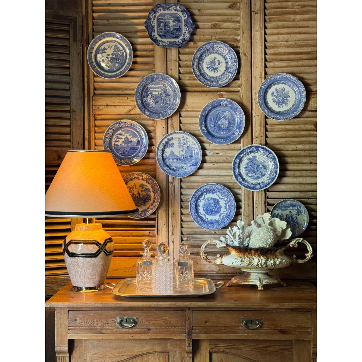 A substantial vintage table lamp featuring a heavy ceramic base with a crackle glaze finish in soft blush tones, accented with black and gilt geometric banding. The form and decoration draw on classic Art Deco styling, with bold linear detailing wrapping around the body of the lamp. The base sits on a gilt plinth and has a nice weight to it, giving it a solid and quality feel. It retains its original tapered shade, finished in a textured neutral fabric with dark trim which complements the tones of the base beautifully. A great statement lamp for a sideboard, console or bedside, particularly in interiors that mix vintage pieces with more traditional or maximalist styling. Shade included. Marks to shade and base consistent with age.
