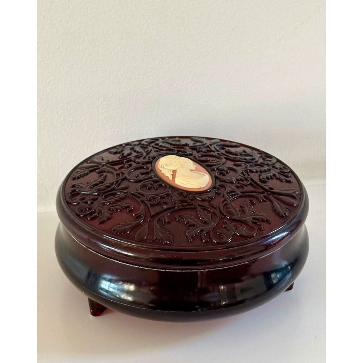 Made of moulded plastic and features an oval cameo, surrounded by raised designs. The lid comes off the round box to reveal a storage spot for jewellery, trinkets or other items. This item has 3 plastic feet around the outer edge.
